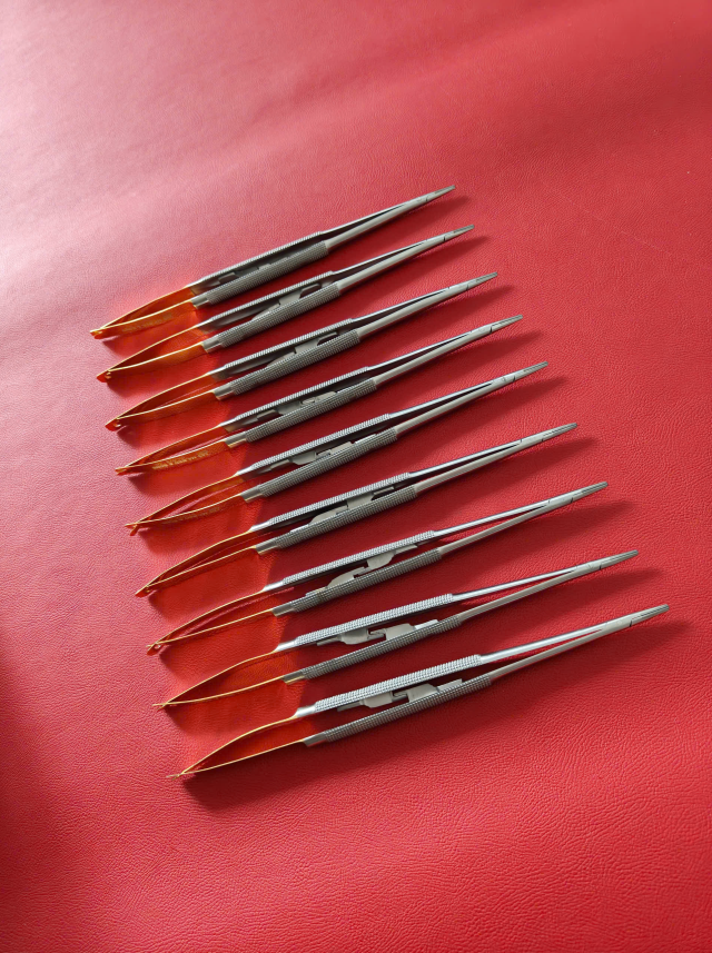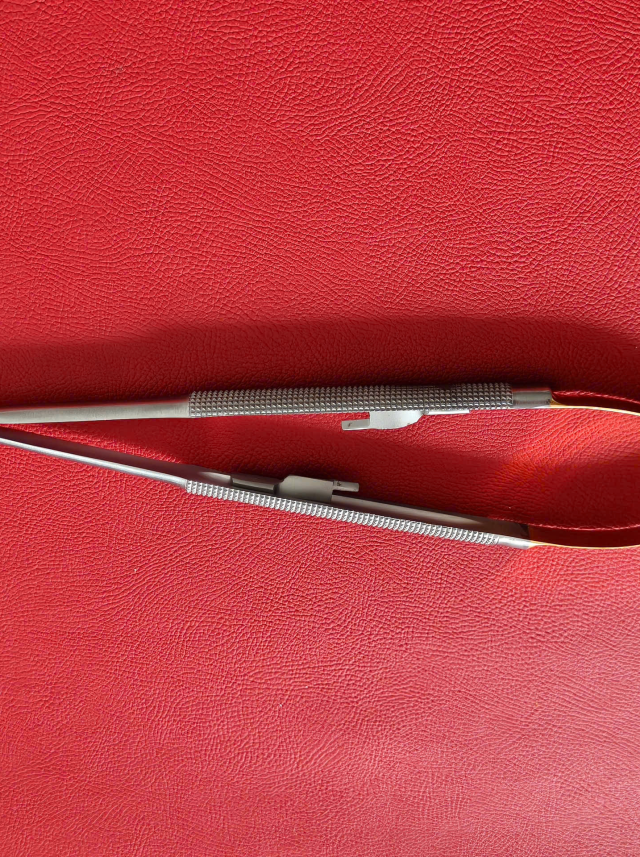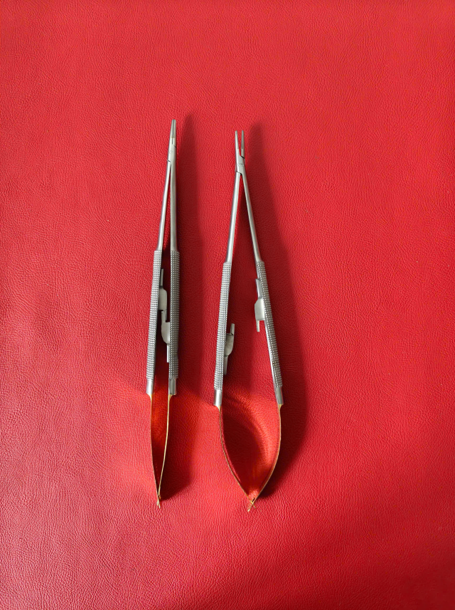 Thiết kế kẹp kim lá lúa (Vannas) → giữ kim chắc, ổn định, không làm biến dạng kim