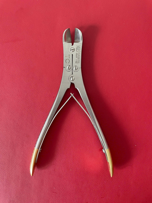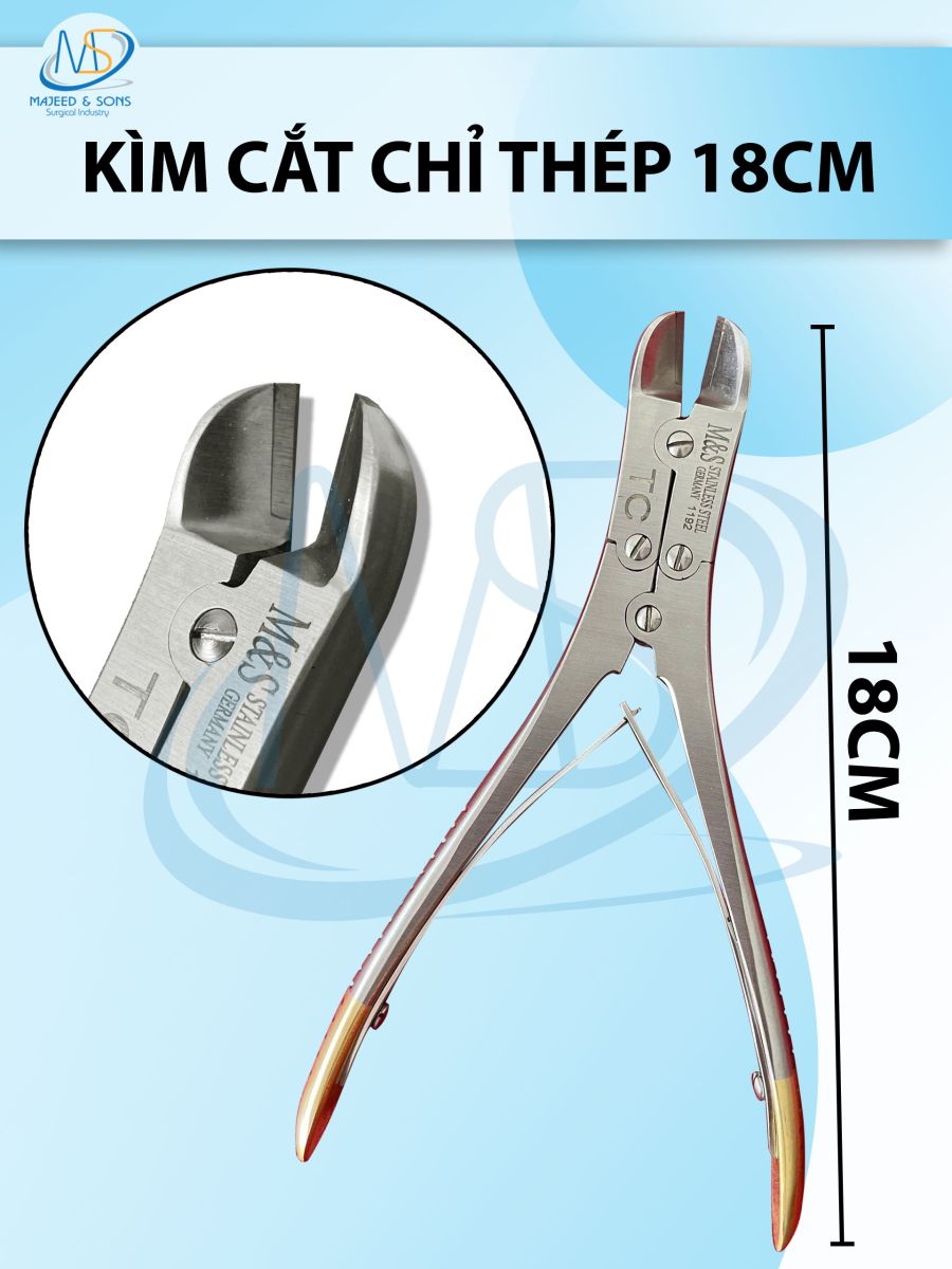 👉 Kìm cắt chỉ thép 18cm là dụng cụ dùng để cắt các loại chỉ thép hoặc dây kim loại trong phẫu thuật xương khớp.