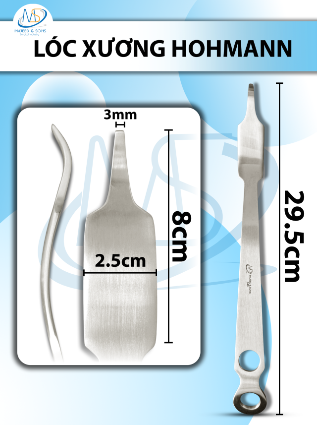 👉 Đối tượng sử dụng: Lóc xương Hohmann Dài 29,5cm đầu dài 8cm rộng bự 2,5cm nhỏ 3mm. Dùng trong y tế, bệnh viện, viện thẩm mỹ,...