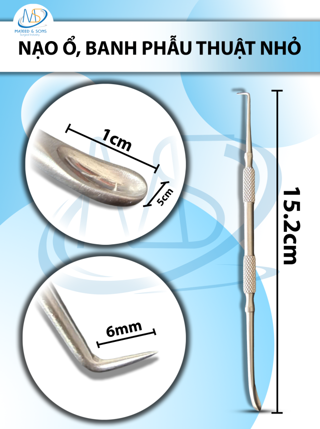 🔷 LƯU Ý: Nạo ổ, banh phẫu nhỏ Dài 15,2cm, đầu nạo d1xr0,5cm, Đầu banh nhọn d0,6cm