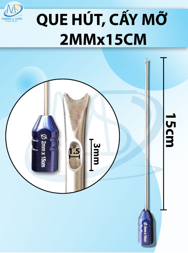 🔷 Que hút mỡ 1 lỗ có đầu tách mô 3mmx15cm, lỗ D5 R1,5