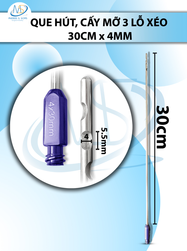 🔷 Que hút mỡ 30cm x 4mm 3 lỗ xéo lỗ D5.5mm R4mm
