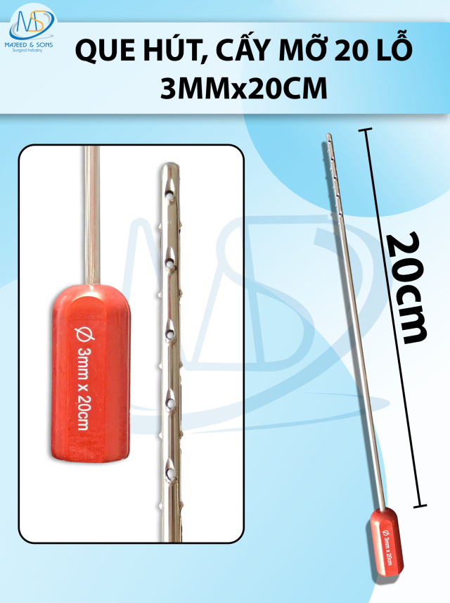 👉 Tên SP: Que hút mỡ cấy 20 lỗ, lỗ sắc bén cắt mỡ tốt 3mmx20cm, lỗ 1x1mm cán đỏ